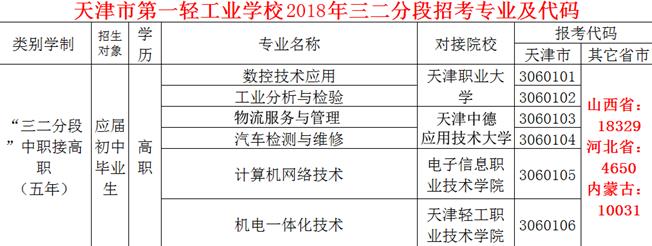 "三二分段"中高职连读班是天津市教委 2002 年在天津市八所国家级重点中职学校(包括我校)试点的基础上, 2003 年开始通过国家级、部分省部级重点职业学校向应届初中毕业生推出的最新、最高效的升学方式。它属于列入天津市普通高校招生计划的第一学历教育,不同于以往高自考、成人高考等升学的第二学历教育。它利用五年的时间完成高等职业教育,比普通高中(三年)毕业后再继续完成同等的高等职业教育(三年),将节省一年的时间,节约一年的费用,提前一年继续升学或就业。 2018年,我校将继续在数控技术应用、工业分析与检验(对接院校为天津职业大学)、物流服务与管理、汽车运用与维修(对接院校为天津中德应用技术大学)、计算机网络技术(对接院校为天津电子信息职业技术学院)、机电一体化技术(对接院校为天津轻工职业技术学院)六个专业进行招生。 从办学实力上看,我校所对接的四所高职院校均为国家级高等职业院校示范校,加之我校是全国中职示范校,称得上是强强联合;从招生专业上看,六个专业均为各校国家、天津市骨干专业,示范校重点支持建设专业,就业前景好,发展空间广,绝对称得上是强强联合。